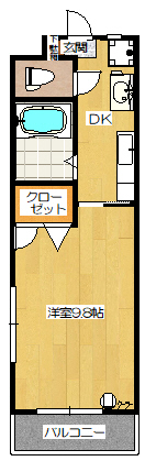 | 間取詳細 | 1K(キッチン、洋室9.8帖) |